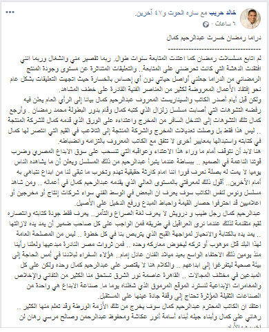 اعتقد أن الكاتب المحترم عبدالرحيم كمال سوف يخرج من تلك الأزمة الورطة، وقد تعلم منها الكثير ، رهاني على كمال وأبناء جيله أبناء أسامة أنور عكاشة ومحفوظ عبدالرحمن وصالح مرسي رهان لن اخسره والأيام بيننا.