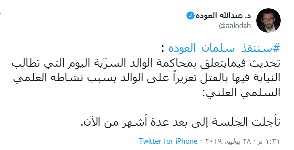 ودون نجل العودة عبدالله في حسابه علي موقع التواصل الاجتماعي “تويتر” : “لم يتم إحضار والدي إلى قاعة المحاكمة”، مضيفا “الجلسة المقبلة ستكون في كانون الأول/ديسمبر”.