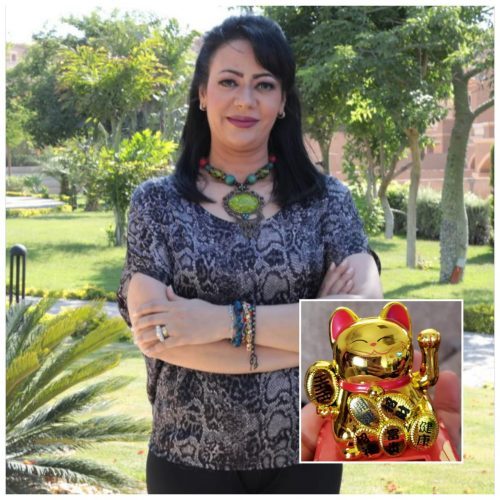 وقالت إن قط الثروه Lucky cat من أهم رموز الفينغ شوى الذي يساعدك على اتخاذ القرارات الماديه والتجاريه، ويكون دائما بيد متحركه.
