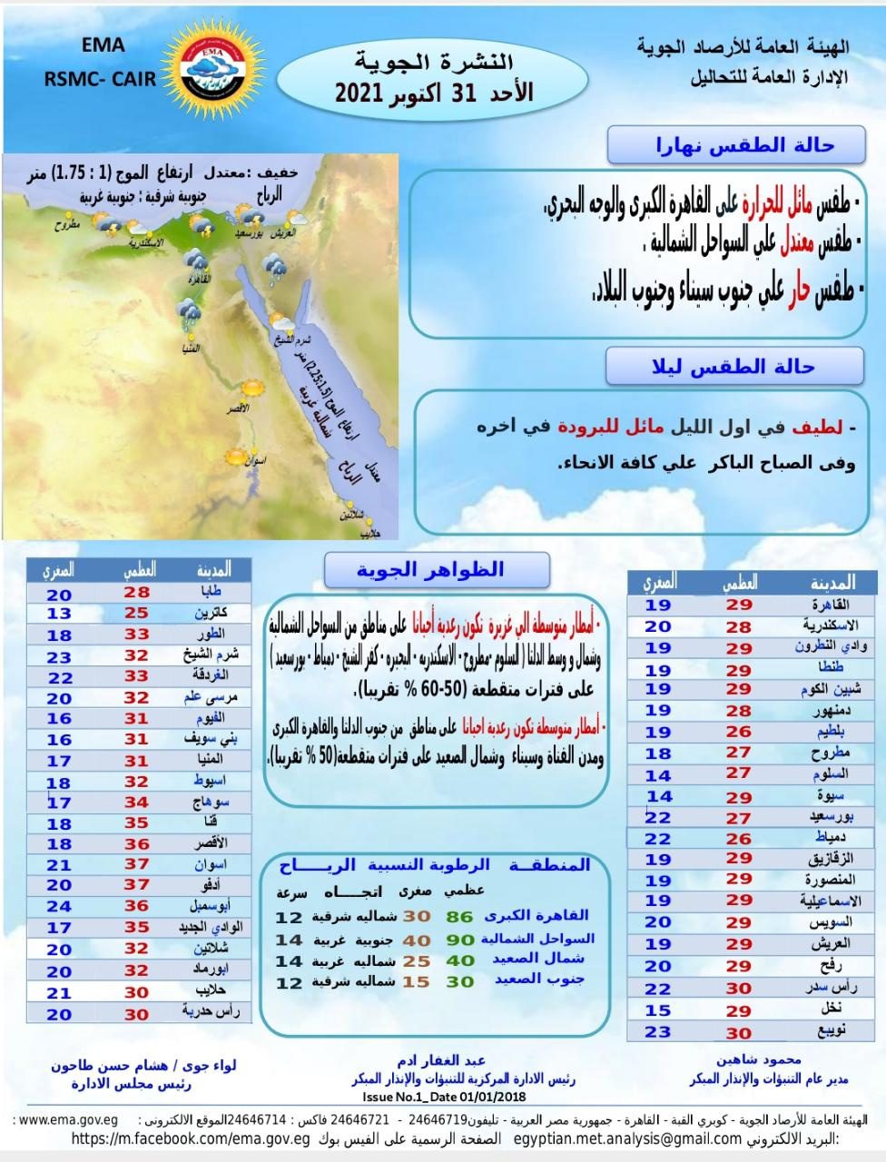وتكون درجة الحرارة المتوقعة في الفيوم وبني سويف 31-16درجة، المنيا 31-17 درجة، أسيوط 32-18 درجة، سوهاج 34-17 درجة، قنا 36-18 درجة، الأقصر 36-18 درجة.